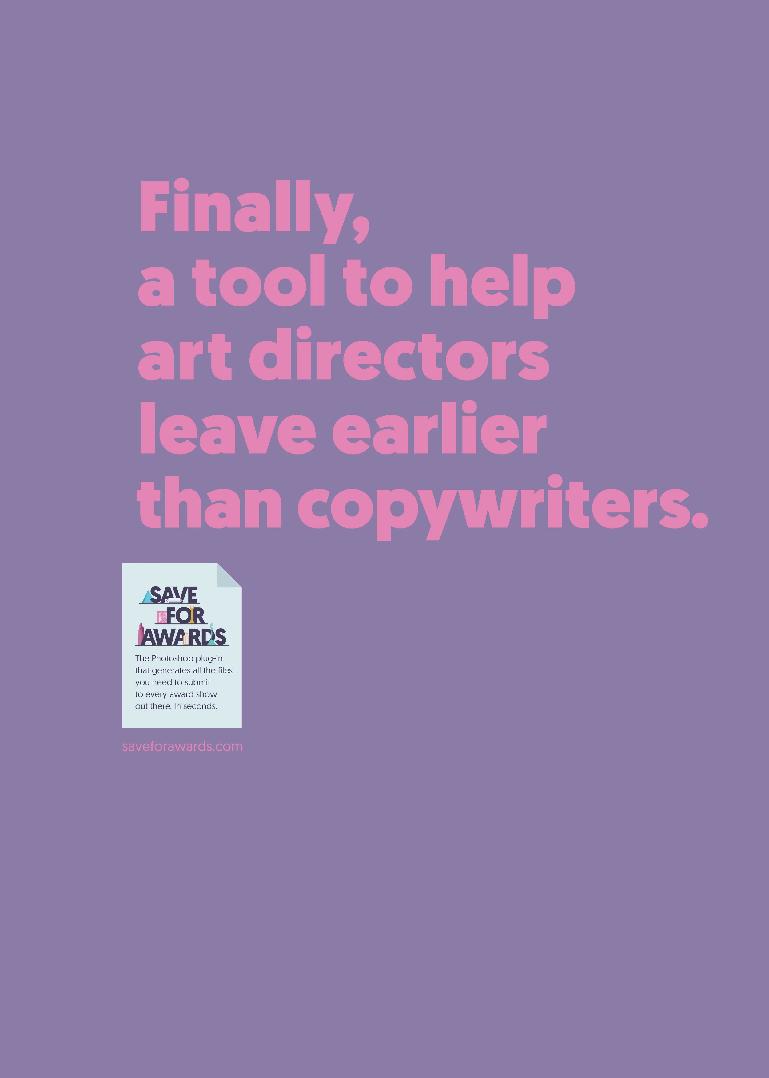 We started out by winning their hearts. We created Save For Awards – a Photoshop plug-in that takes print ads and presentation boards and converts them into the size and format required by all major award shows out there, in seconds. No more late nights digging out file specs for the different categories of every single festival, and then adjusting each ad into those specs by hand. Cool, right? It’s every award-hungry art director’s wet dream.